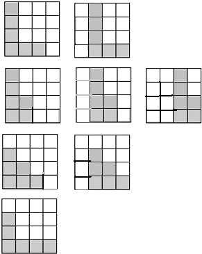 种涂色的图案.分析:按照要求把4x4方格的6个格子进行涂色,左侧的涂色的方格数大于或等于右侧涂色的方格数,把6分成几个数的和,左边的数最大是4,例如4+1+1=6,涂在第一列开始或从第二列开始有2种图案;