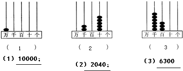 .分析:本题是根据计数器上的珠子写数,个位上几个珠子就表示几个一、十位上几个珠子就表示几个十、百位上几个珠子就表示几个百…哪一位上一个珠子也没有就表示“0”.据此从高位到低位依次写出各计数器所表示的数.