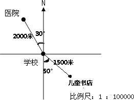 (2)儿童书店在学校南偏东50°方向1500米处,在图中表示出它的位置.