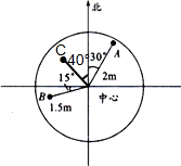 (1)李成的球的落点在中心北偏东30°,2米处,