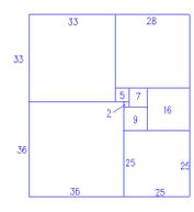 请用9个边长分别是2,5,7,9,16,25,28,33,36的正方形,拼出一个长方形,在你拼出的图形中标上有关数据.