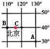 解:(1)C的位置可以用北纬40°,东经120°表示;