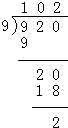920÷9=102…2.