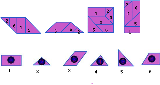 分析:在给出的6块图形中,先找到哪两块图形可以拼成三角形、梯形,哪三块可以拼成三角形、梯形、平行四边形、正方形,再结合要拼成图形的形状、大小来选取小图形拼合.