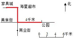 (1)根据题干可得,线段比例尺为:图上距离0.5厘米代表实际距离1千米,所以美食街距离海星超市图上距离0.5×3=1.5厘米,由此可以画出这条美食街如图所示;