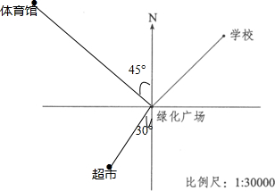 (2)超市在绿化广场南偏西30°,600米处,请你标出它的位置,体育馆在绿化广场的北偏西45°,1200米处,请你标出它的位置.
