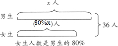 分析:女生是男生人数的80%,是把男生的人数看成单位“1”,那么设男生的人数为x人,女生的人数就是80%x人,它们的和是36人,由此列出方程求解.