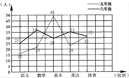 将五、六年年级参加兴趣小组的人数绘制成折线统计图.