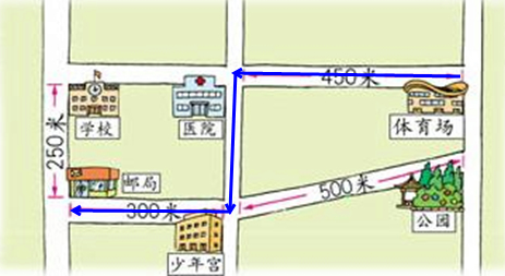 如下图所示:从体育场向西450米到医院,再向南250米,然后向西300米即可到达邮局,并且路程正好是450+250+300=1千米;