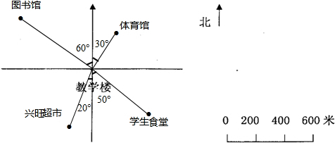 (2)兴旺超市在教学楼南偏西20°方向400米处.