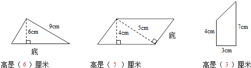 分析:从三角形一个顶点向它的对应边作一条垂线,顶点和垂足之间的线段称三角形这条边上的高,这条边叫做底;在平行四边形中,从一条边上的任意一点向对边作垂线,这点与垂足间的距离叫做以这条边为底的平行四边形的高;梯形两底间的距离叫做梯形的高;据此解答即可.