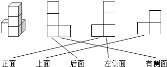 (2)观察图形可知,从正面看到的图形是两列:右边一列3个正方形,左边一列1个正方形靠下边;从上面看到的图形是两行:前面一行2个正方形,后面一行1个正方形靠右边;从后面看到的图形是两列:左边一列3个正方形,右边一列1个正方形靠下边;从左侧面看到的图形与正面看到的图形相同;从右侧面看到的图形与从后面看到的图形相同,据此即可连线.