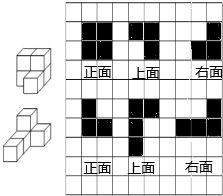 分析:图形(1),从正面:看到4个小方格,即“田”字形小方格;从上面看:上面2个,下面靠右边一个;从右面看:两层,最下层两个,上层靠右一个;