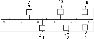 在数轴上方的框内填入适当的假分数,在数轴下方的框内填入适当的带分数.