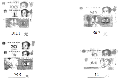 分析:(1)左上图是1张100元的,1张1元的,1张1角的,化成相同单位元再相加即可.