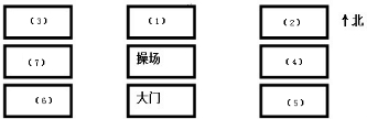 分析:依据地图上的方向辨别方法,即“上北下南,左西右东”以及题干中的其他信息,可将(1)教学楼 (2)宿舍楼 (3)语音室 (4)图书馆 (5)实验楼 (6)食堂 (7)艺术楼在图上标出.