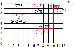 (1)活动中心的位置为:(3,5);超市的位置为(7,7);