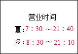 夏天上午7时30分开门营业,晚上9时40分停止营业;冬天8时30分开门营业,晚上比夏天提前半小时停止营业.