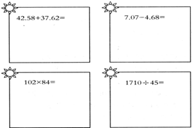 | 1-0.5= | 4.2+2.6= | 8.7-3.5= | 3.6+5.2= |