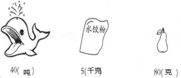 分析:根据生活经验、对质量单位和数据大小的认识,可知:一条鲸鱼重40吨;一袋水饺粉重5千克;一个茄子重80克;