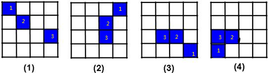 ③、(1)中在三行四列的蓝色正方形3,在(2)、(3)中每次都向左移动一个格;到(4)中即如图所示.