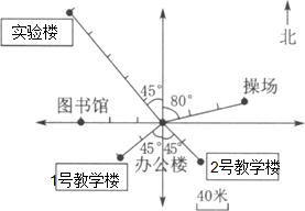 (1)1号教学楼在办公楼南偏西45°方向80米处;2号教学楼在办公楼南偏东45°方向80米处;实验楼在办公楼北偏西45°方向200米处.请你在上图中标出来.
