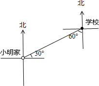 学校在小明家东偏北30度方向,小明家就在学校,南偏西南偏西60度的方向,看物体的方位不同了,角度也就不同了.