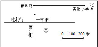 分析:(1)根据上北下南,左西右东的方位辨别法得到镇政府位于十字街北面;根据比例尺,经过测量计算可得镇政府到十字街的实际距离为200米;