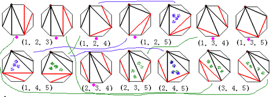 (3)若以A点引出3条对角线,依次保留(1、2、3);(1、2、4);(1、2、5);(1、3、4);(1、3、5);(1、4、5);(2、3、4);(2、3、5);(2、4、5);(3、4、5);得出14种剖分方法,如下图所示: