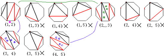 (4)以点A引出2两条对角线,依次保留:(1、2);(1、3);(1、4);(1、5);(2、3);(2、4);(2、5);(3、4);(3、5);(4、5),得到4种剖分方法: