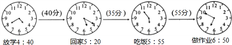 .分析:钟面上12个数字把钟面平均分成12大格,时针走1大格是1小时,分针走1大格是5分.放学时时针指向数字4与5之间,分针指向8,此时是4:40,回家用了40分,用放学时刻加上40分就是到家的时刻,此时是5:20,吃饭时时针指向5和6之间,分针指向11,此时是5:55,用吃饭的时刻减去到家的时刻,是35分,6:50开始做作业,用开始做作业的时刻减去吃饭的时刻,就是从吃饭到做作业经过了多少时间.