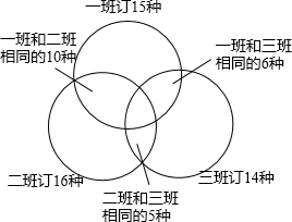 种.分析:根据容斥原理可得:三个班一共订了15+16+14=45种,其中重复相加了一班和二班相同的有10种,二班和三班相同的有5种,一班和三班相同的有6种,所以一共有45-10-6-5=24种,这比已知的25种少了1种,是因为三个班都订的杂志种数被重复多减了1次;据此即可解答.