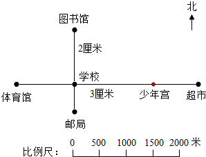 (2)在学校的正东面1500米处是少年宫,在图上学校距少年宫______厘米,请你在图上标出少年宫的位置.