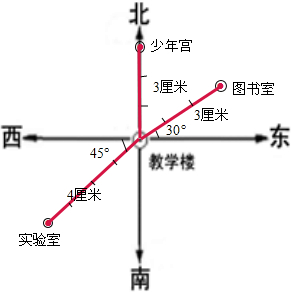 (2)图书室在教学楼东偏北30度,距离是300米.