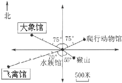 分析:从图上就可直接看清楚爬行动物馆、猴山和水族馆的方向关系,又因图上距离1厘米表示实际距离500米,图上距离都已经标出,用乘法计算即可求出其实际距离;根据大象馆在水族馆的北偏西75°方向1500米处,得出左上方位置是大象馆;根据飞禽馆在水族馆的南偏西70°方向2500米处得出飞禽馆在左下方.