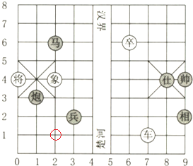 将的位置是(0,4);炮的位置是(1,3);象的位置是(2,4);兵的位置是(3,2);马的位置是(2,6);车的位置是(7,1);相的位置是(9,2);仕的位置是(8,4);卒的位置是(6,6);帅的位置是(9,4);