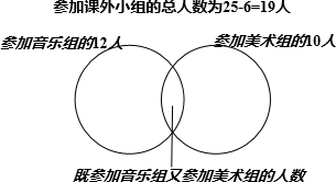 分析:此题可以画图分析:参加音乐组和参加美术组的人数为:12+10=22人,而根据题干可得:参加课外小组的实际人数为:25-6=19人,则多出的22-19=3人就是既参加音乐组又参加美术组的人数,
