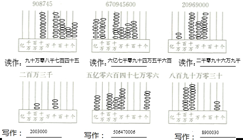 分析:每个数位上数字是几,就在这位上拨几个珠子,整数的写法是:从高位写起,一级一级的往下写,哪个数位上是几就写几,如果哪个数位上一个单位也没有,就在那个数位上写0来表示.即可读出或写出这个数.