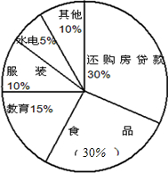 分析:(1)把小明家这个月的生活支出看作一个整体,也就是单位“1”,用1减去教育支出的15%,购服装支出的10%,水电支出的5%,还购房贷款支出的30%和其他支出的10%就是食品支出所占的百分数.