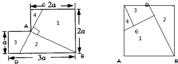 如下图所示,连接AB两点,然后做AB的垂线,这两条线正是剪刀剪两次的位置,按照右图的顺序排列起来,刚好得到一个正方形,拼成的正方形和原图形的面积相等.