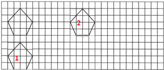 根据图形的平移的定义,把五边形的五个顶点分别向下平移5格,再依次连接起来即可得出图形1;把五边形的五个顶点分别向右平移10格,再依次连接起来,即可得出图形2,据此即可解决问题.