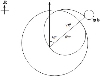 学校北面围外边有一根桩,拴着一只羊,绳子长6米,请按1:200的比例尺把羊活动的最大范围表示出来,在桩北偏东50°方向7米处长着一小块茂盛的青草,羊够得着吗?在图中画出来.
