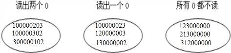 读出两个0的有:100000203(读作:一亿零二百零三)、100000302(读作:一亿零三百零二)、300000102(读作:三亿零一百零二);
