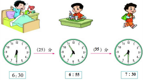 分析:(1)第一个钟表指示的时刻是6:30,第二个钟表指示的时刻是6:55,第三个钟表指示的时刻是7:30;从6:55到7:30又经过了35分.