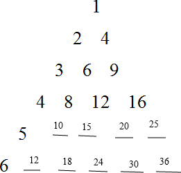 排列规律为:每一行开始的数字依次比上面一行开始的数字大1,每一行的数字从这个数的1倍开始,到这个数的平方数结束.