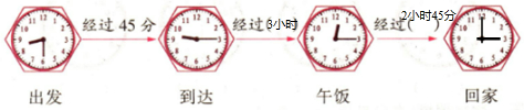 分析:由图可以看出,上午8时30分出发,结过45分,也就是9时15分到达;吃午饭时间是中午12时15分,用吃午饭的时间减去到达时刻,就是这段经过的时间;下午4时回家,这段时间是用回家的时间减去开始吃饭的时刻.
