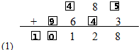 分析:(1)先从和的个位数字8分析:因为5+3=8,所以上面的加数的个位数字是5;再看和的十位数字2:因为8+4=12,所以下面的加数的十位数字是4;再看和的百位数字是1:因为6加上进位的1是7,7+4=11,所以上面的加数的百位数字是4;又因为和是五位数,所以下面的加数千位数字是9,由此可得这个竖式是485+9643=10128;