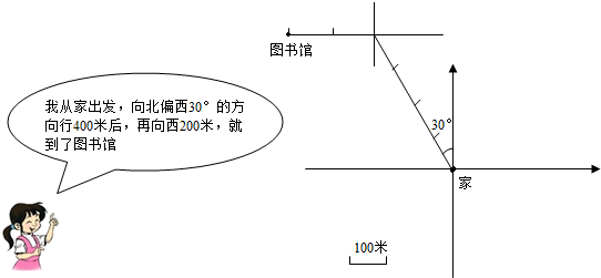 以家为观测中心,画出北偏西30°的方向,由此即可画出小朋友的行走路线图,并标出图书馆的位置如图所示: