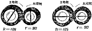 有一对紧贴的传动胶轮,每个轮子上都画有一条通过轴心的标志线(如图).主动轮的半径是105 厘米,从动轮的半径是90厘米.开始转动时,两个轮子上的标志线在一条直线上.问:主动轮至少转了几转后,两轮的标志线又在一条直线上?