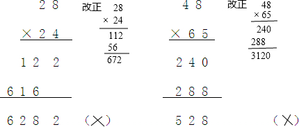 (1)个位上的4和28相乘及十位上的2和28相乘的结果不正确,